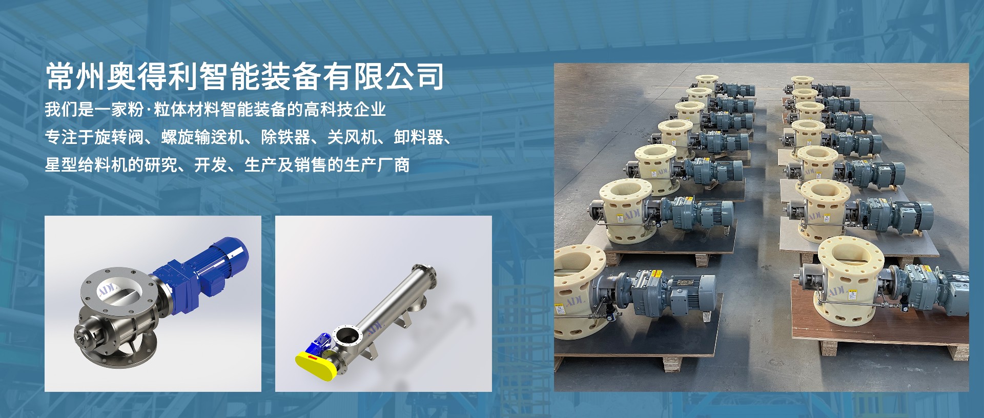 常州奥得利智能装备有限公司,是一家专注于旋转阀、关风机、卸料器、锂电专用星型给料机的研究、开发、生产及销售的高科技企业,公司自成立以来,始终坚持以人才为本、诚信立业的经营原则,荟萃业界精英,将国外先进的信息技术、管理方法及企业经验与国内企业的具体实际相结合,为企业提供全方位的解决方案,帮助企业提高管理水平和生产能力,使企业在激烈的市场竞争中始终保持竞争力,实现企业快速、稳定地发展。